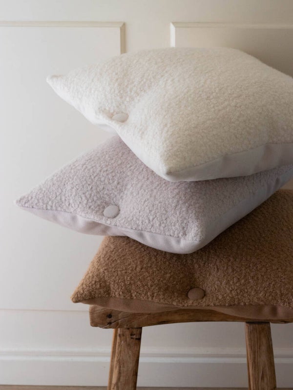 Het kussen is gemaakt van mooie grove bouclé stof, waardoor het kussen een mooie structuur heeft aan de voorzijde. De stof van de achterzijde is gemaakt van een mooie wollen gladde stof, waardoor