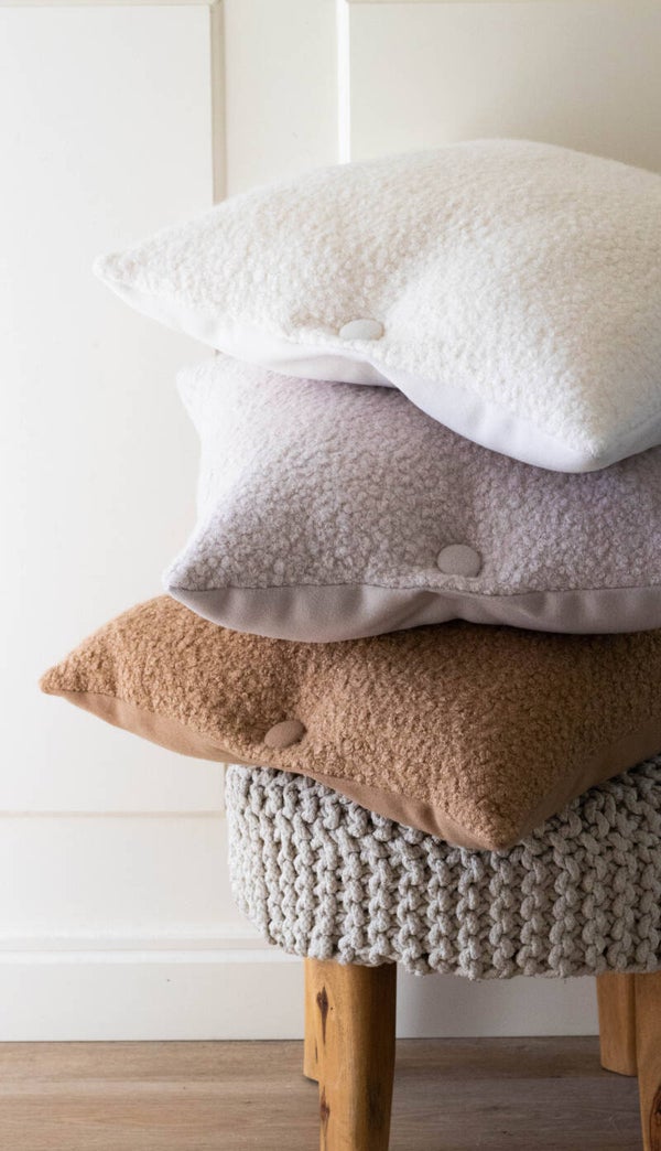 Het kussen is gemaakt van mooie grove bouclé stof, waardoor het kussen een mooie structuur heeft aan de voorzijde. De stof van de achterzijde is gemaakt van een mooie wollen gladde stof, waardoor