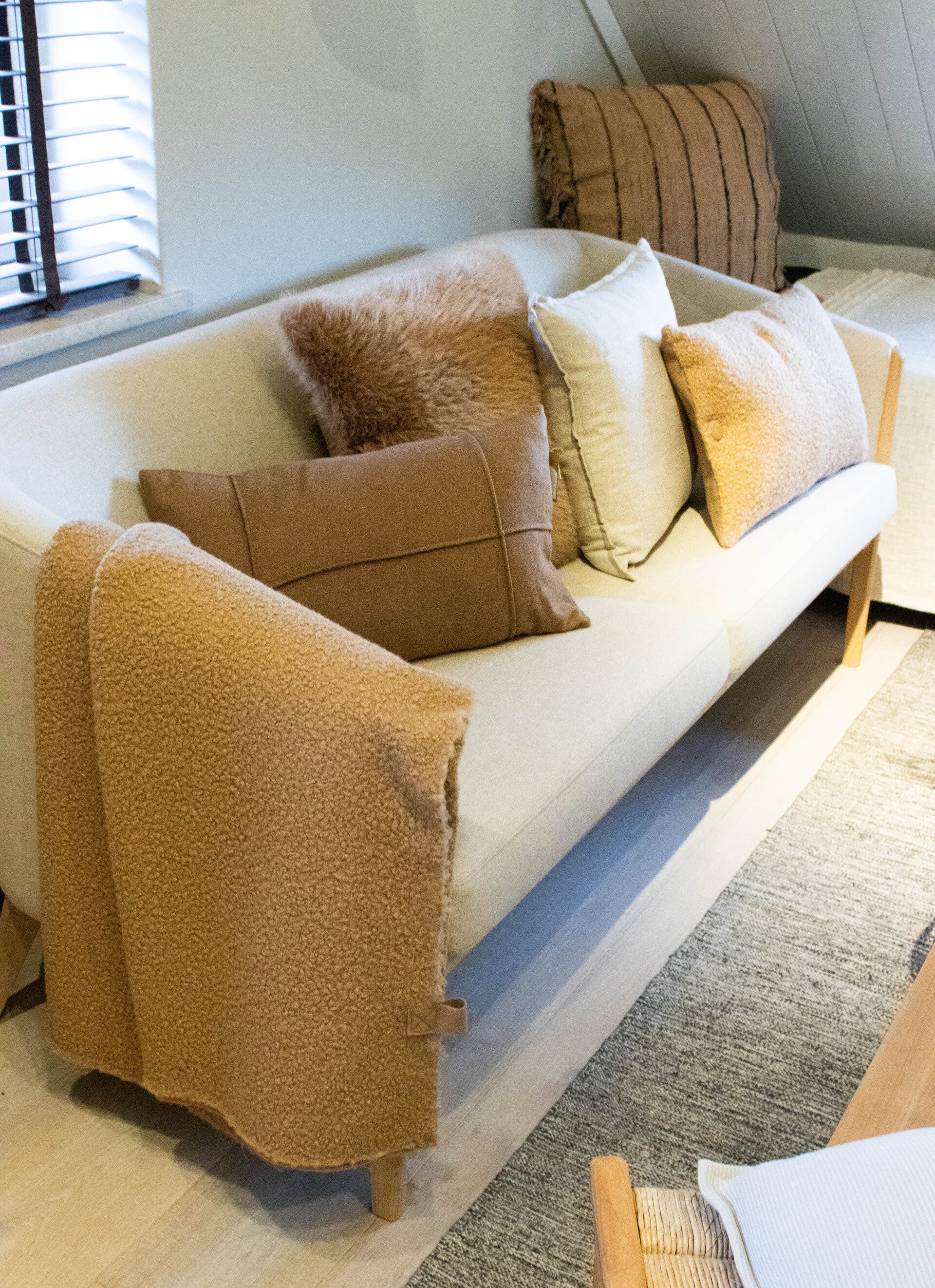 Het plaid is gemaakt van mooie grove bouclé stof, waardoor het plaid een mooie ‘teddy-achtige” structuur heeft. Het plaid heeft aan de achterzijde een gladdere wolachtige structuur, waardoor er een mooi contrast ontstaat tussen de voor en achterzijde. De met de hand uitgekamde randen zorgen voor een mooie fluffy afwerking. De lus geeft een stoer accent aan het plaid.