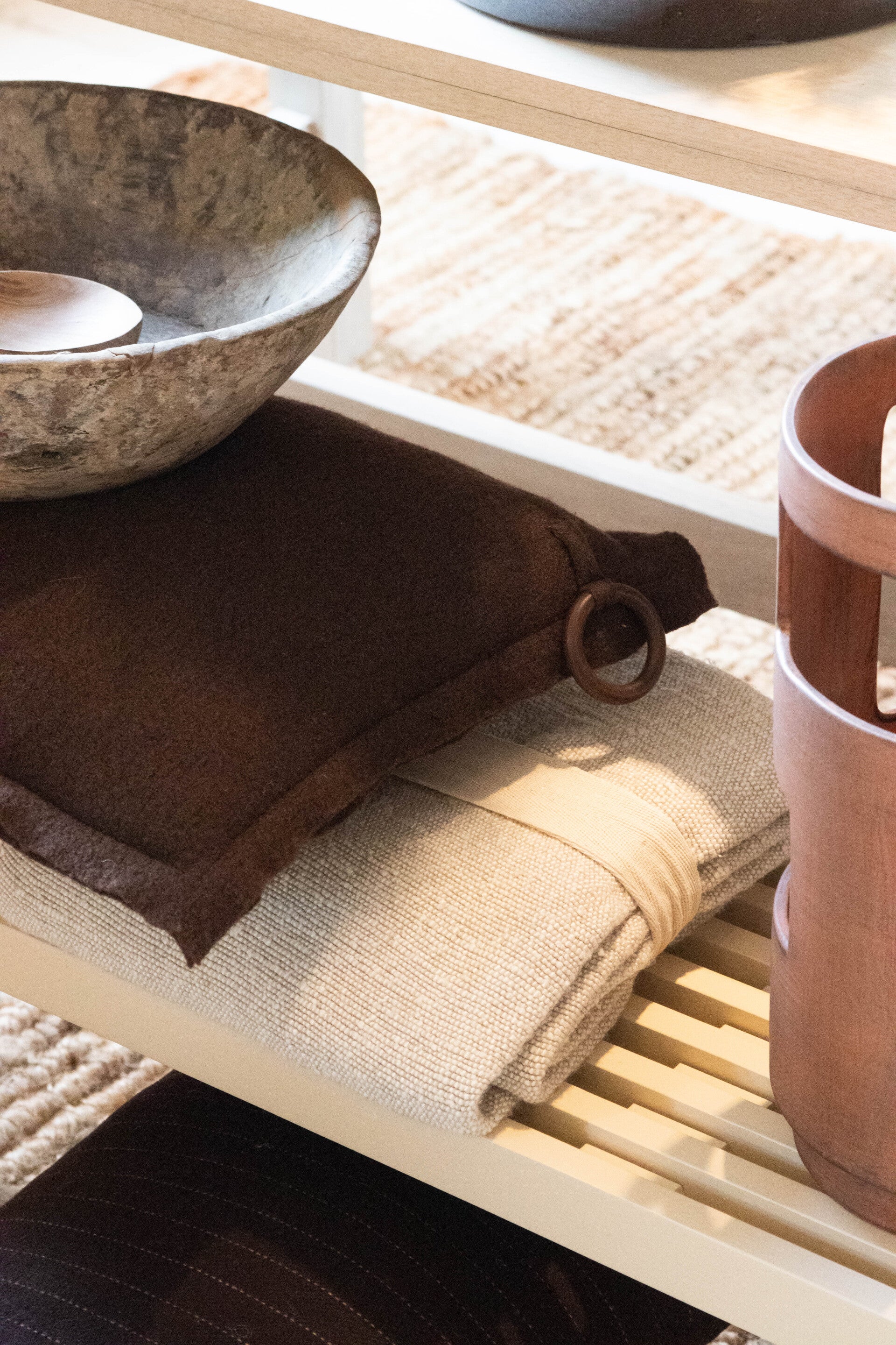 Het kussen met ’70 look is gemaakt van mooie gekookte wollen stof met een decoratieve houten ring aan de zijkant. De stof van de achterzijde is gemaakt van dezelfde stof met rits.