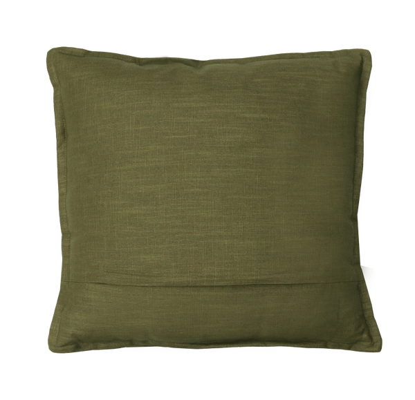 Het kussen is gemaakt van een grove linnen stof met doorgestikte naden aan zijkant.