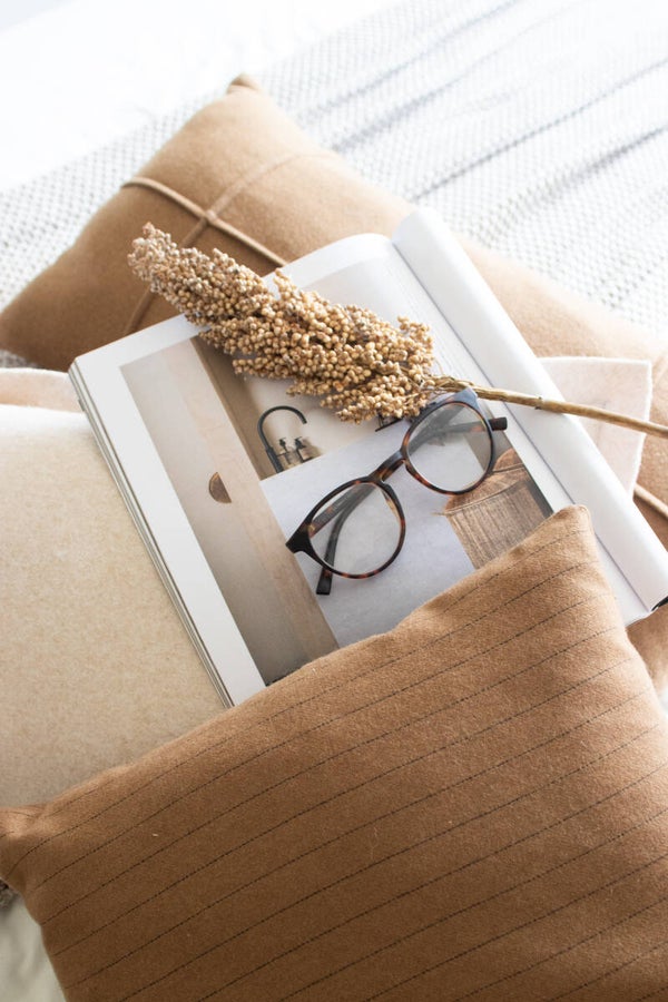 Het kussen is verkrijgbaar in de trendy kleuren donkerbruin en camel.