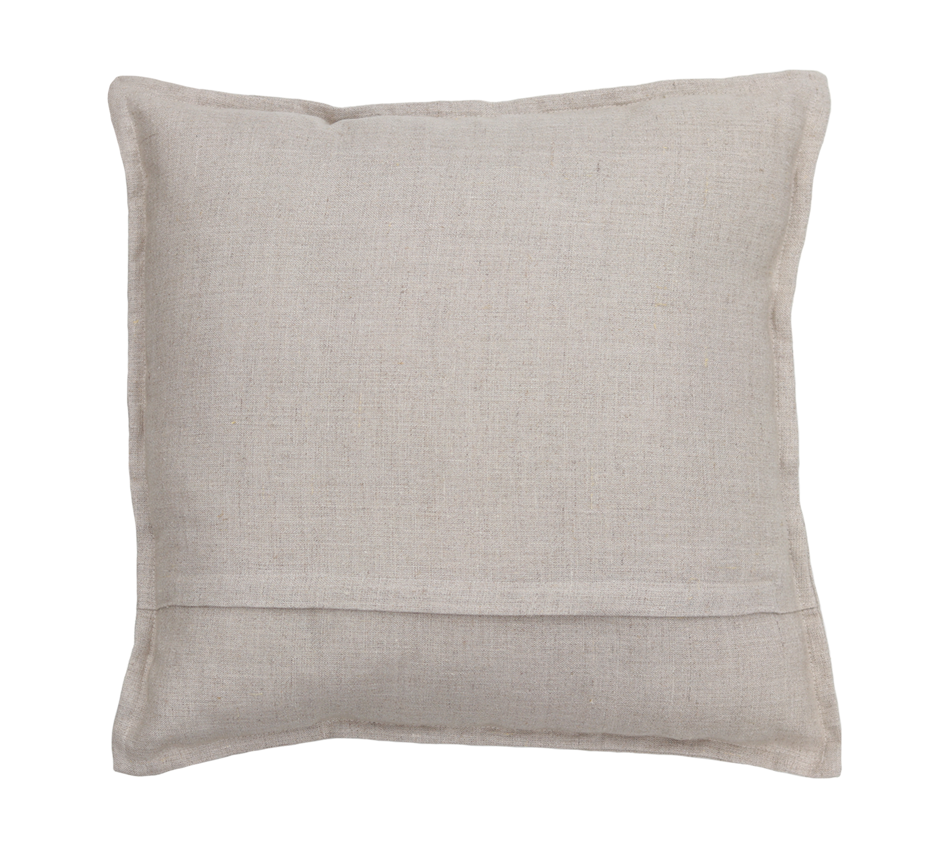 Het kussen is gemaakt van een grove linnen stof met doorgestikte naden aan zijkant.
