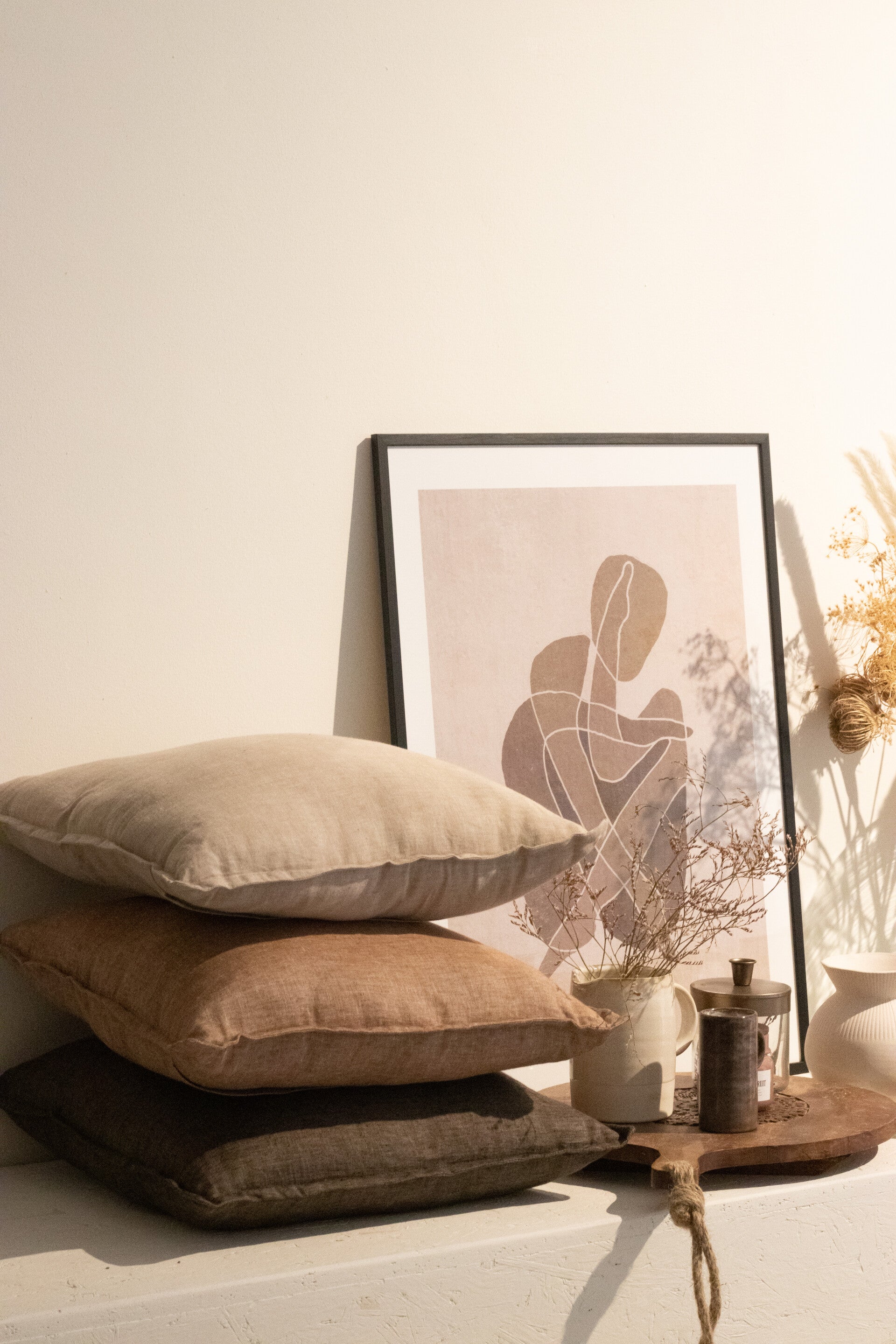 Het kussen is gemaakt van een fijn geweven linnen stof met doorgestikte naden aan zijkant.