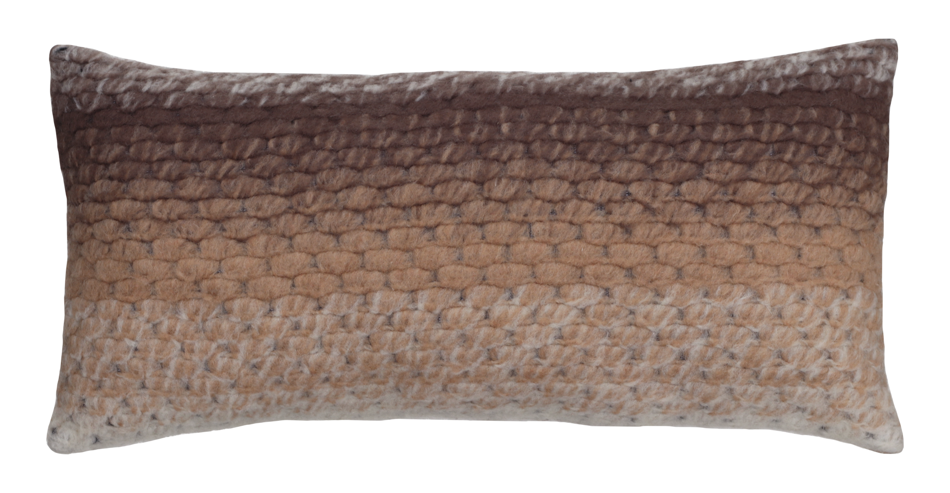 Het kussen is gemaakt van een mooie wollen stof met een verloop van bruin ecru en camel.